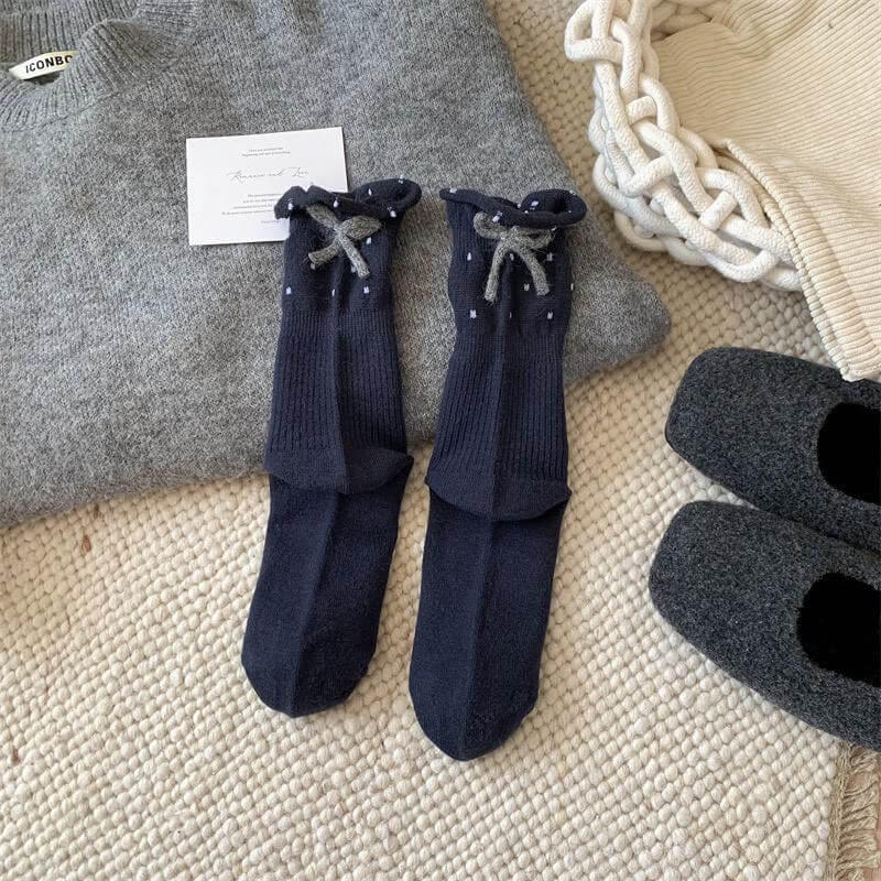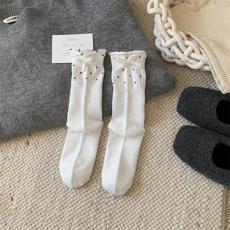 D0117P-秋冬新款暖絨波點蝴蝶結中筒襪1組5雙-預購
