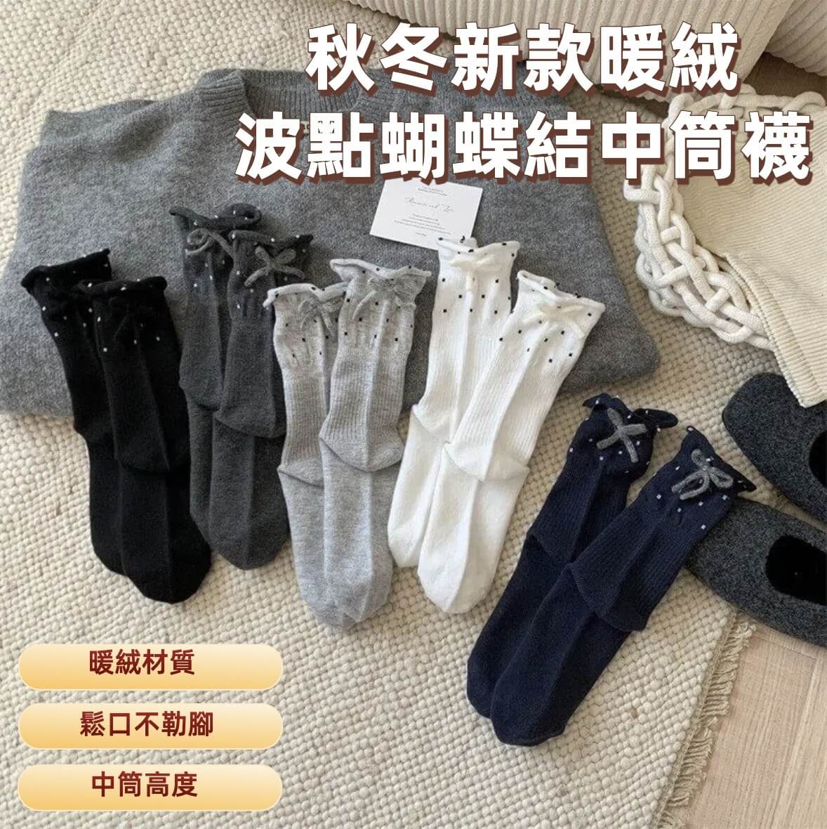 D0117P-秋冬新款暖絨波點蝴蝶結中筒襪1組5雙-預購